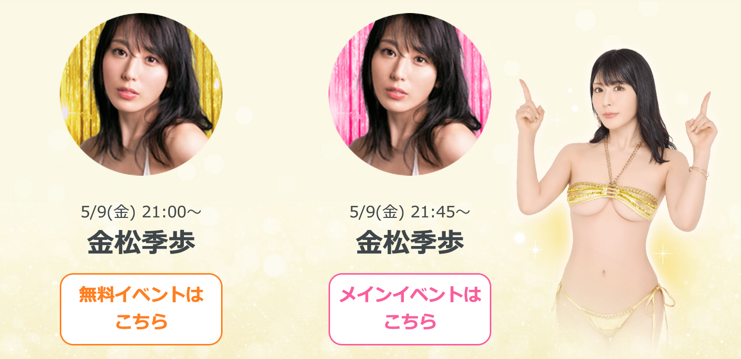 また、今回のライブチャットは金松季歩さんのみ開催予定で、5月9日(金)21:00~無料イベントが、同日21:45~メインイベントが開催されるようです。