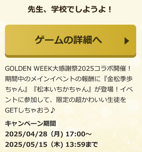 現在、FANZA動画フロアにて≪GOLDEN WEEK大感謝祭2025≫が開催されており、それと連動して現開催中の教育イベントにGW大感謝祭2025コラボ生徒が登場しています。