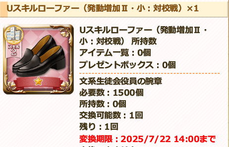 この腕章は、校長室の『アイテム変換所』(生徒会戦TOP画面からも行ける)にて各種アイテムと交換できる代物であり、このアイテム交換所でもUスキルローファーをGETできます。