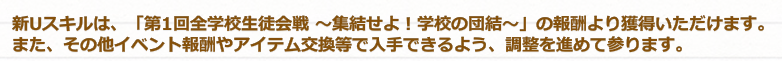 また、今回追加された新Uスキルアクセサリーは『対校戦』と明記されており、他のUスキルアクセサリー同様『対校戦』『模擬試験(全校生徒総力戦)』の2つに分かれるようです。