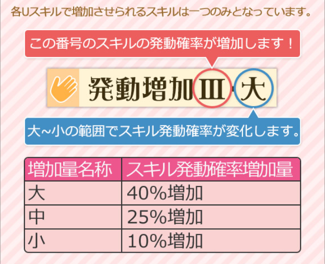 新Uスキル【発動増加】は、対応するスキルの発動確率を一定数アップするUスキルです。
