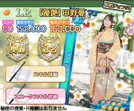 上述の謹賀新年ガチャでご紹介したLR【優艶】田野憂(文)とはおすすめの編成位置が異なるので、同時に編成すれば文系の強化も捗りますね。