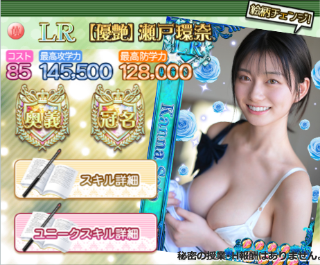 瀬戸環奈も、スキル性能こそやや抑えめではありますが、奥義が非常に優秀です(準備時間1分半で、15分間体育クラスの攻学力を550%UPできる)。