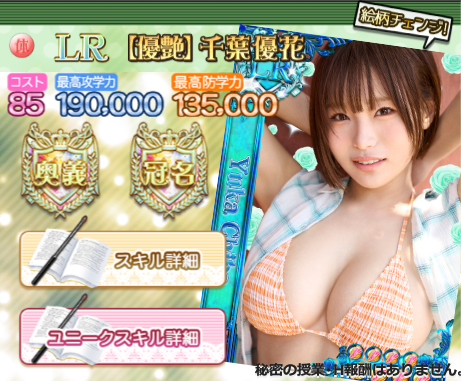 性能的にはLR【優艶】千葉優花 (体)のほうがガチャ産生徒に近いかなという感じです。